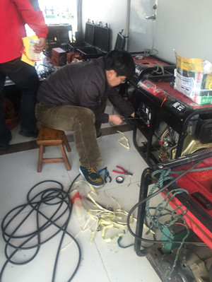 图为河道勘测中心职工丁劳武、杨来宝、刘庆文正在测试压力式水位仪。另外,水文测船上谢承忠进行电路检查,许荣喜进行机械维护。