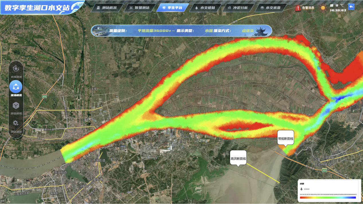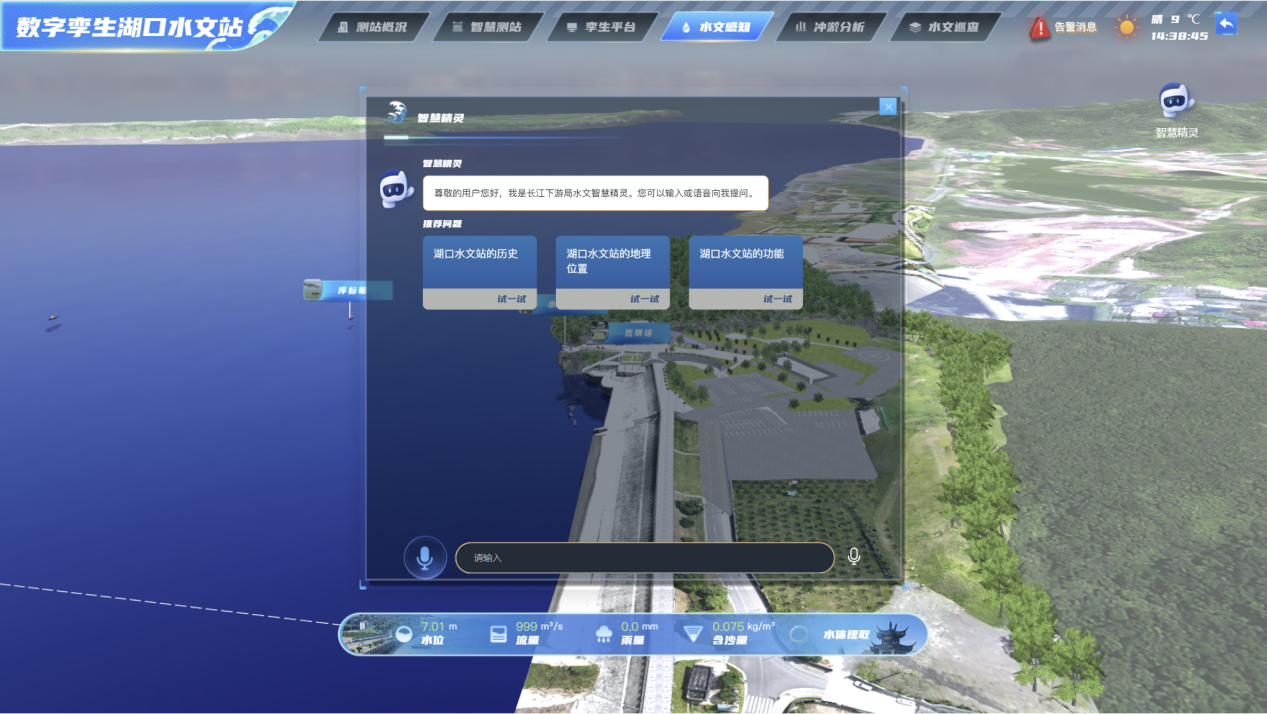 湖口水文站数字孪生平台结合卫星影像提取的长江湖口流域水体情况,运用大模型技术,建成了集智慧水情、孪生模拟、水体提取、冲淤分析等功能于一体,能模拟洪水演变、流场变化、流速测验及冲淤分析等。另一方面,通过与智慧精灵对话,平台用户可直观获取水文站水位、流量、流速、告警信息等数据,更好了解湖口水文站概况。
